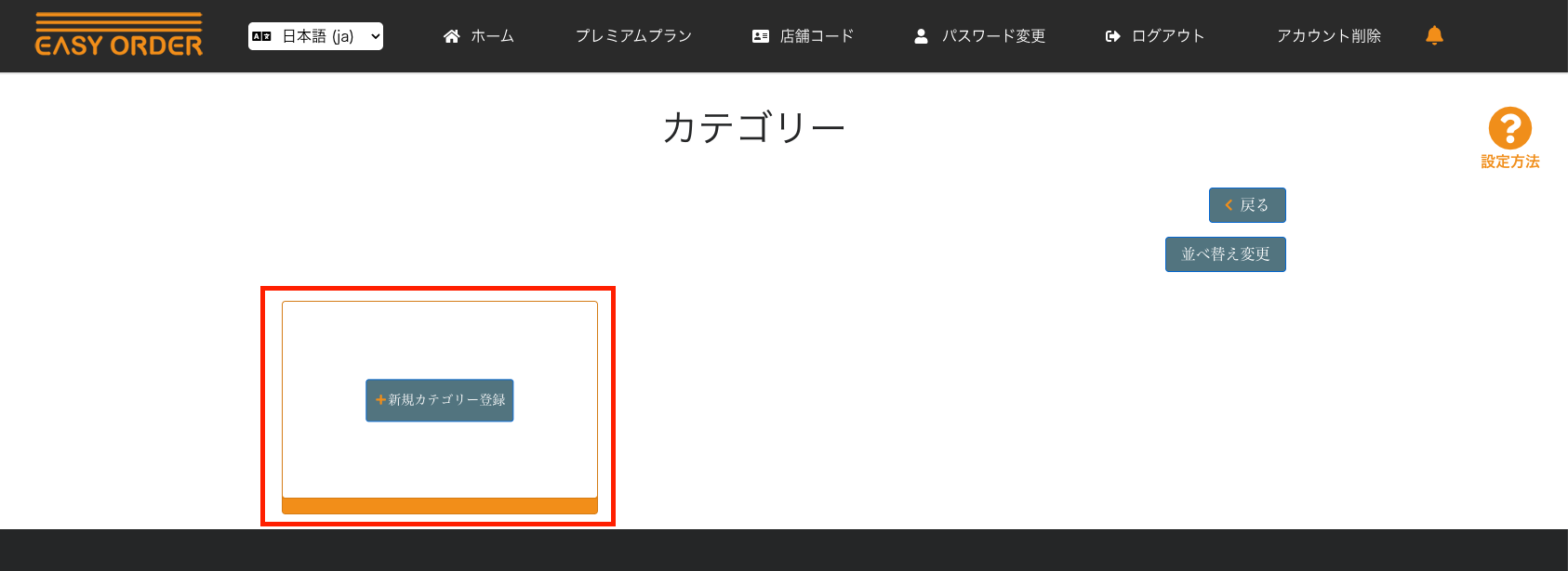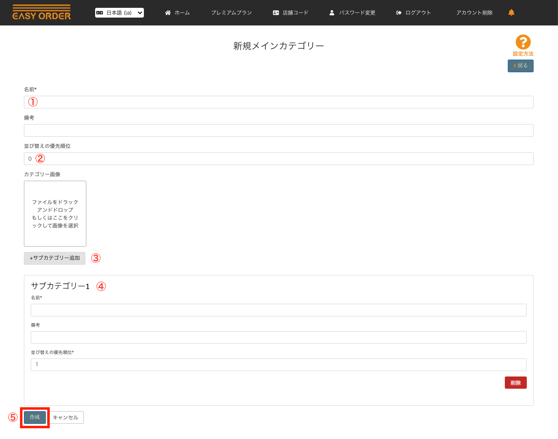 ④ 必要に応じてサブカテゴリーを設定します。(メニュー登録に必要なため、1つ以上登録してください)
