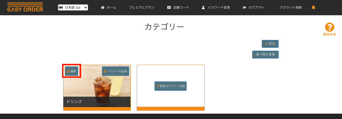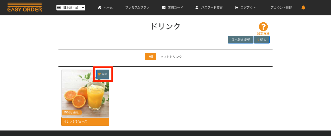 登録済みのメニューの情報を修正する場合、変更したいメニューの「編集」ボタンをクリックします。