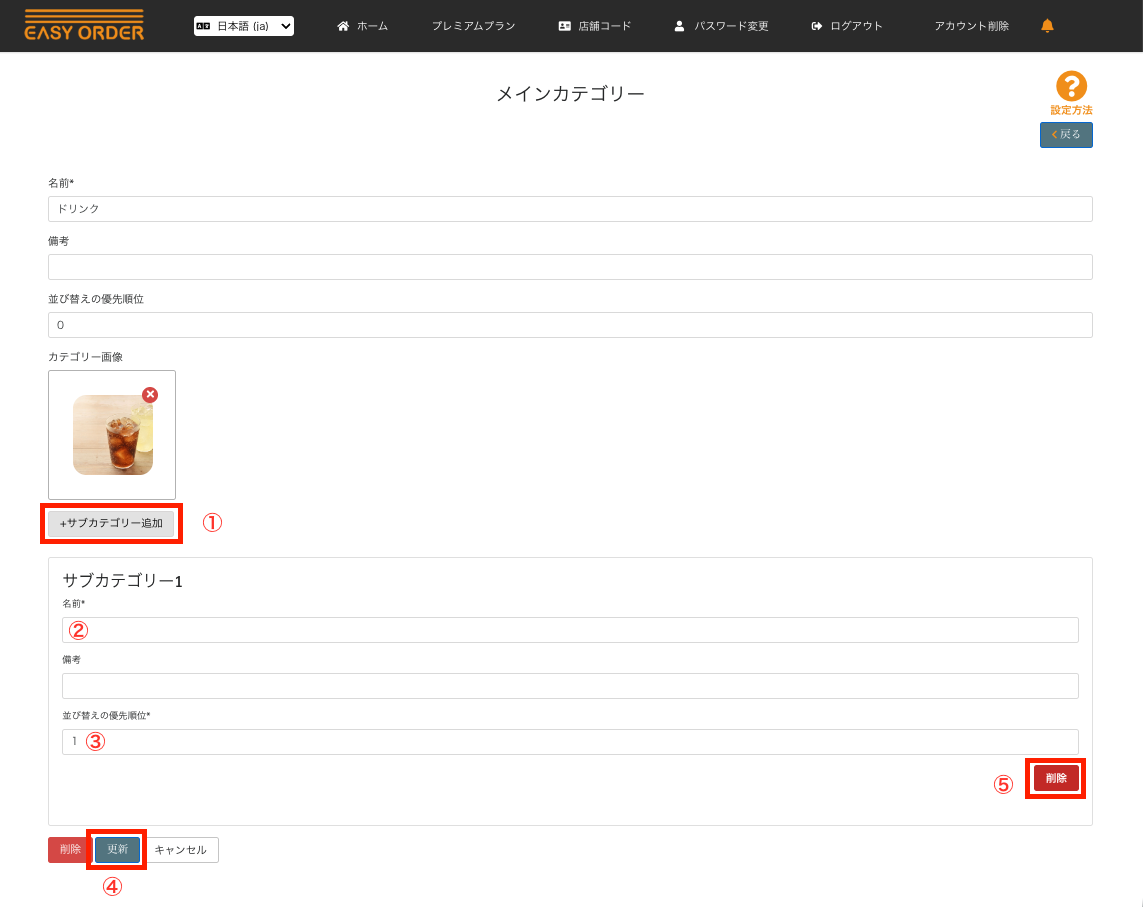 ⑤ サブカテゴリーを削除したい場合はこちらの「削除」ボタンをクリックします。
