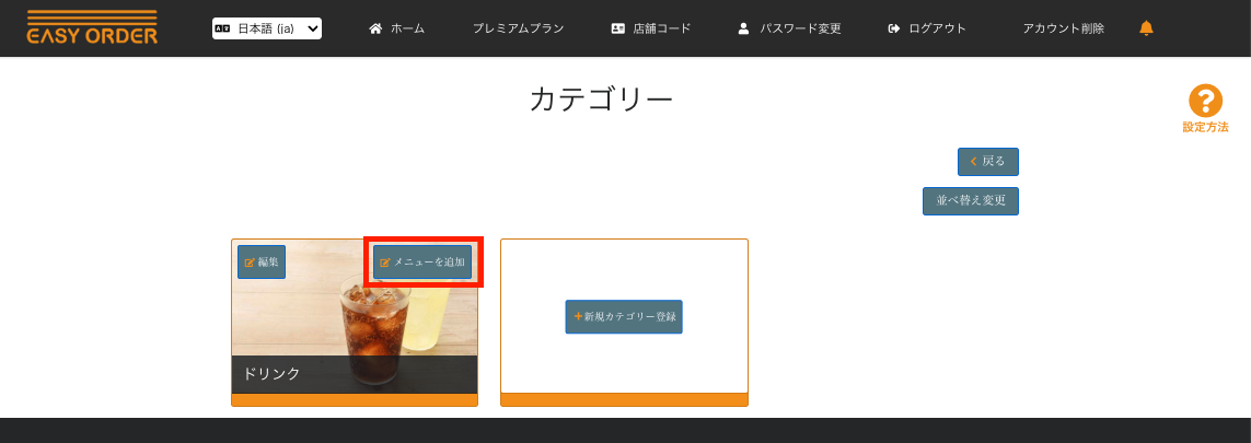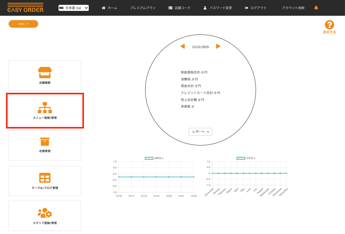 「メニュー登録・管理」では、メニューやカテゴリーの追加・価格設定などが行えます。