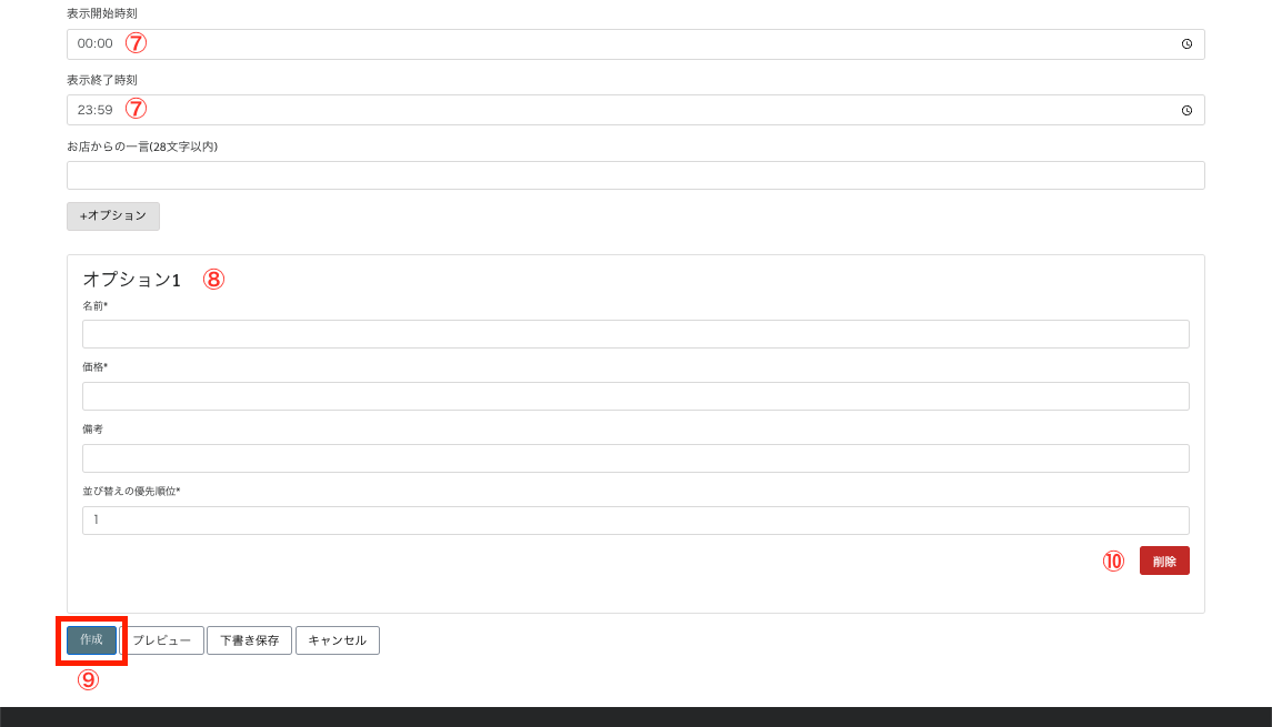 ⑩ オプションを削除したい場合はこちらの「削除」をクリックします。